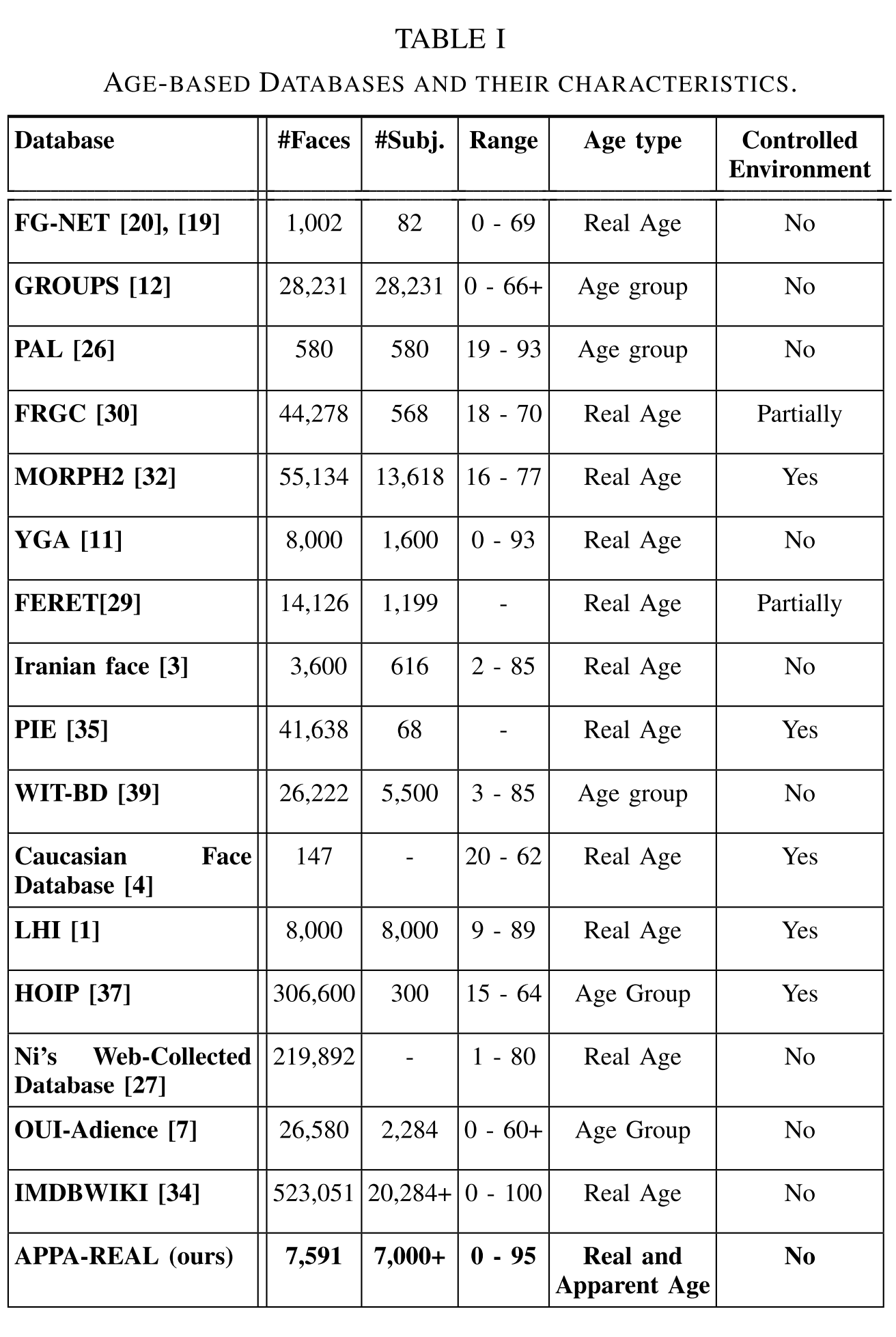 Furthermore, we provide per-image summaries in gt_avg_train.csv, gt_avg_valid.csv and gt_avg_test.csv, showing the number of ratings, average apparent age, standard deviation of apparent age and the real age for each image. A comparison of Age datasets characteristics is shown in the table 1.