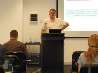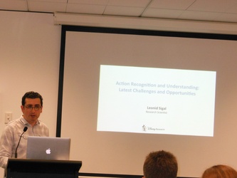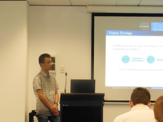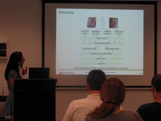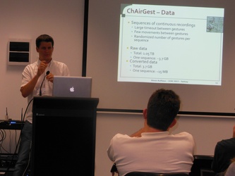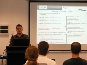 2013 Multi-modal Gesture Recognition Workshop ICMI Description Schedule Associated events People Organizers Invited speakers Co-chairs Program Committee Program Gallery Workshop gallery Opening. Leonid Sigal, Disney Research. Challenge results presentation. Cristian Sminchisescu, Lund University. Fusing Multi-modal Features for Gesture Recognition (1st Prize): Jiaxiang Wu, Jian Cheng, Chaoyang Zhao and Hanqing Lu A Multi Modal Approach to Gesture Recognition from Audio and Video Data (3rd Prize): Immanuel Bayer, Thierry Silbermann. Antonis Argyros, Univ. of Crete, Institute of Computer Science. Online RGB-D Gesture Recognition with Extreme Learning Machines: Xi Chen and Markus Koskela. Richard Bowden, University of Surrey. ChAirGest - A Challenge for Multimodal Mid-Air Gesture Recognition for close HCI: Simon Ruffieux, Denis Lalanne and Elena Mugellini. ChAirGest - Gesture Spotting and Recognition Using Saliency Detection and Concatenated HMMs: Ying Yin and Randall Davis. Multi-modal Social Signal Analysis for Predicting Agreement in Conversation Settings: Víctor Ponce-López, Sergio Escalera, and Xavier Baró. News There are no news registered in